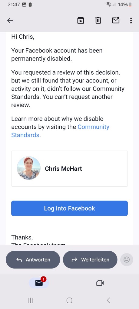 Anyway, because facebook is facebook, that was their final message… and the blue button? That is actually a link to log in to your account… Some days, there are no words.